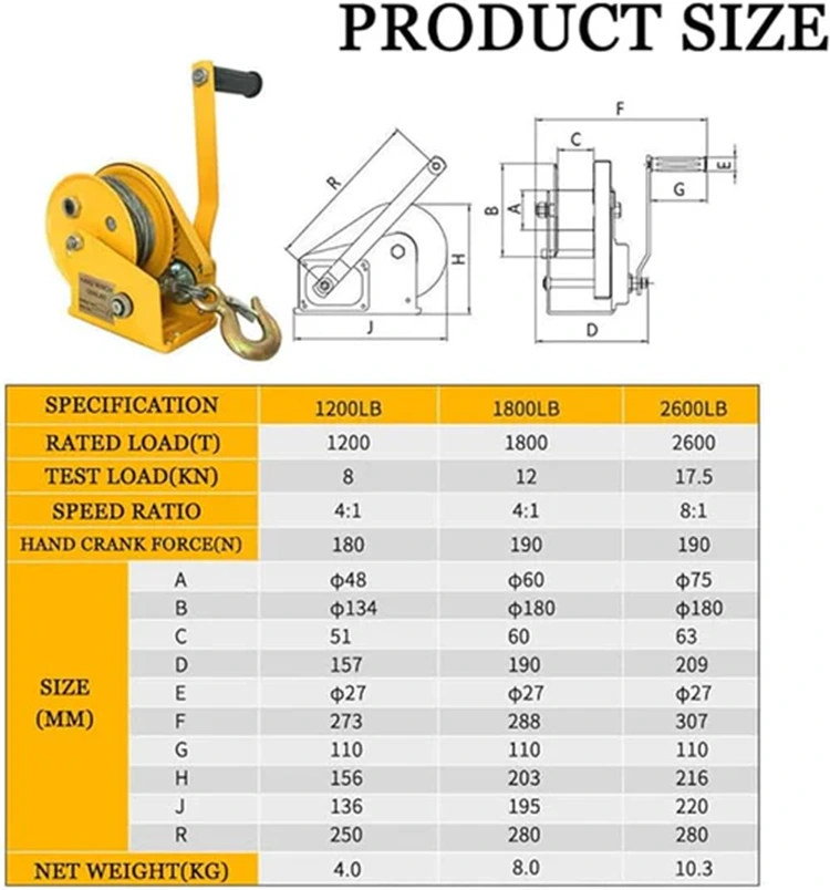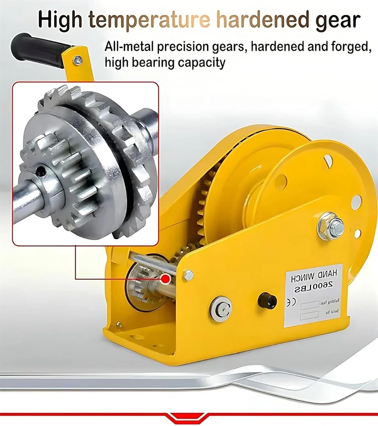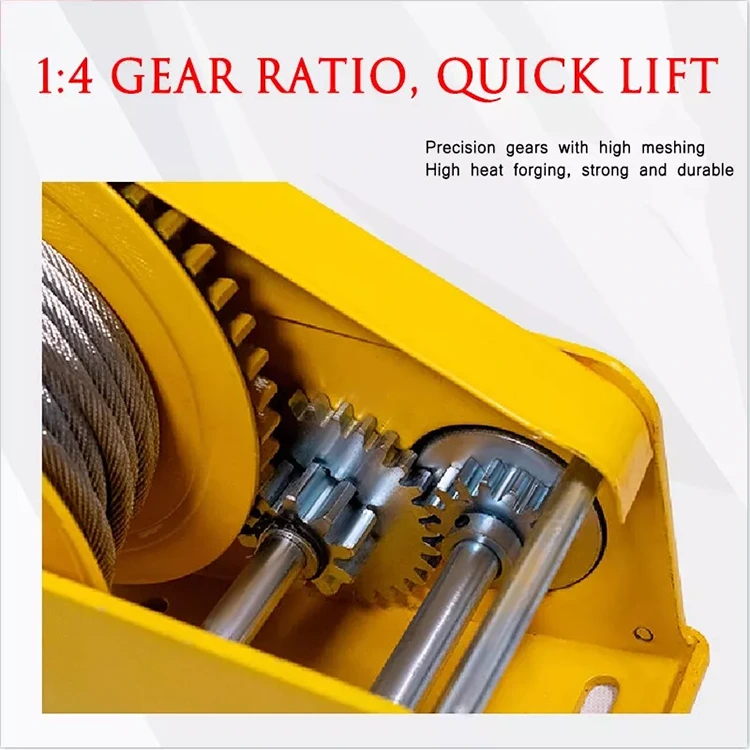 핸들을 흔들면 여러 기어를 통해 동력이 전달되어 작은 회전력이 강철 드럼의 거대한 토크로 변환되어 "천 파운드를 4~2개 들어올리는" 효과를 얻을 수 있습니다. 간단히 말해서 노력을 기울이면 윈치를 통해 몇 배 또는 심지어 10배의 전력을 출력할 수 있어 인력이 크게 절약되고 핸들링, 견인 작업의 효율성이 향상됩니다.